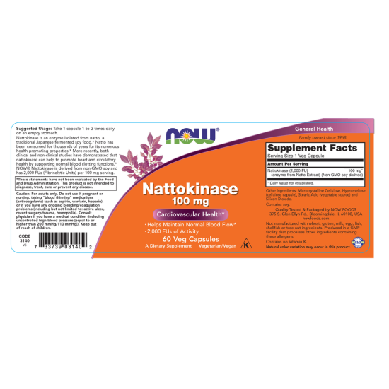 Nattokinase is an enzyme isolated from natto, a traditional Japanese fermented soy food. Natto has been consumed for thousands of years for its numerous health promoting properties. More recently, both clinical and non-clinical studies have demonstrated that nattokinase can help to promote heart and circulatory health by supporting normal blood clotting functions. NOW® Nattokinase is derived from non-GMO soy and has 2,000 FUs (Fibrinolytic Units) per 100 mg serving.