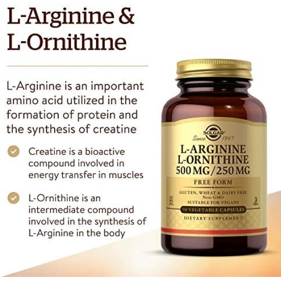 L-Arginine is an amino acid utilized in the formation of protein and the synthesis of creatine, a bioactive compound involved in energy transfer in muscles. L-Ornithine is an intermediate compound involved in the synthesis of L-Arginine in the body. This product provides Free Form L-Arginine and L-Ornithine to promote optimal absorption and assimilation.