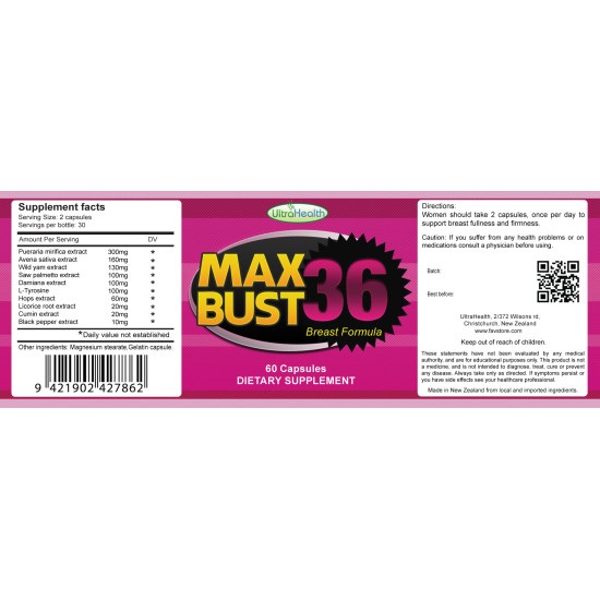 Maxbust36 contains only the finest botanical extracts. Pueraria Mirifica, Avena Sativa, Wild Yam, Saw Palmetto, Damiana, L-Tyrosine, Hops, Licorice root, Cumin, Black Pepper.