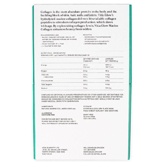 Original Vida Glow is all natural pure marine collagen, derived from the scales of ocean fish, containing no wheat, gluten, sugar, additives, preservatives or flavours. Vida Glow only uses low molecule weight hydrolysed collagen, which is highly bioavailable and holds an absorption rate above 90%. Vida Glow marine collagen is free from any heavy metals, toxins or pollution.