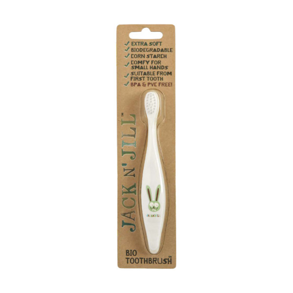 Jack N Jill Bunny Bio ToothbrushExtra softBiodegradableCorn starchComfy for small handsSuitable from first toothBPA & PVC free!Rounded Nylon bristles (SOFT) for superior cleaningErgonomic handle made from 100% Corn Starch (Non GMO!)This pack consists of:Bio Toothbrush x 1 unitThis bio toothbrush..