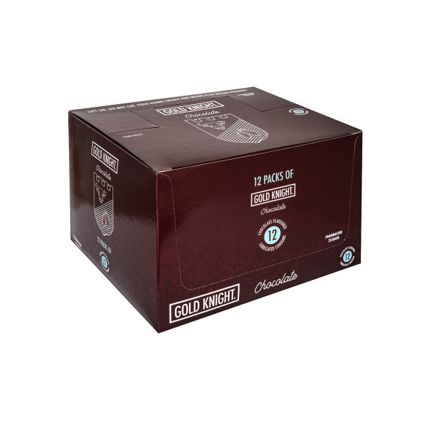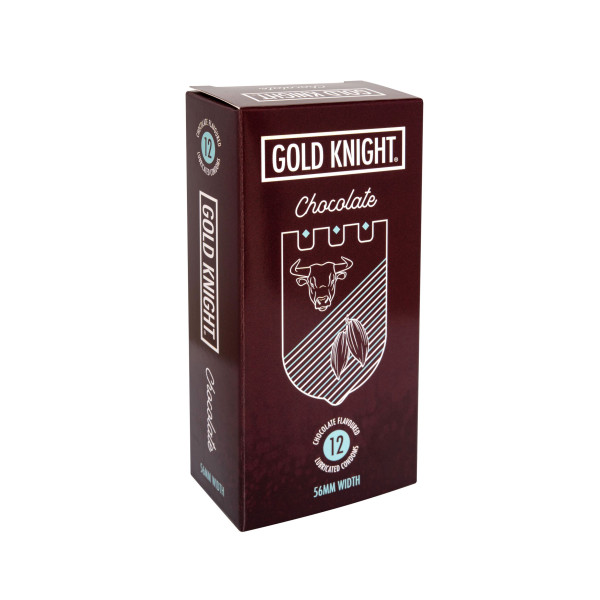 Gold Knight Condoms Chocolate Flavoured 56mm Width 12 x 12 PKGold Knight Chocolate flavoured latex condom 12 x 12 pack.A generous 56mm width lubricated condom.Gold Knight and Shield condoms are 100% vegan. Gold Knight does not use any materials containing casein or non-vegan substances in the m..
