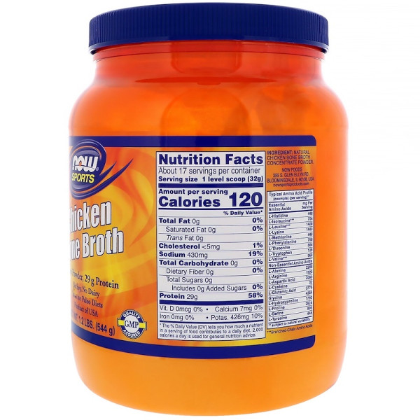 Now Foods Chicken Bone Broth Protein Powder 544gUse for Sports NutritionWhat is Chicken Bone Broth?NOW® Sports Chicken Bone Broth Powder is a premium quality chicken bone extract that’s an excellent source of natural protein.Chicken bone broth is a common food base in many cultures and a natural sou..
