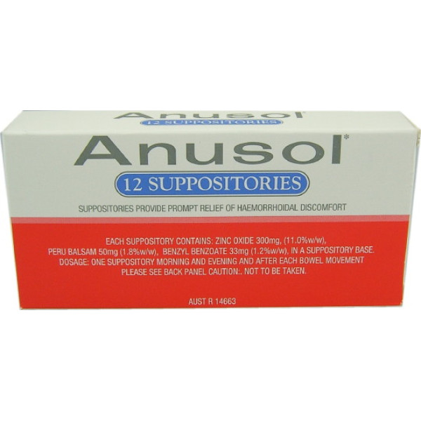 Anusol 12 SuppositoriesSuppositories provide prompt relief of haemorrhoidal discomfortActive Ingredients: Each suppository contains: Zinc Oxide 300mg, IN A SUPPOSITORY BASE.Dosage: One Suppository Morning and Evening and After Each Bowel Movement.Caution: Not to be taken.Product purpose: For the rel..