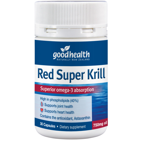 Good Health Red Super Krill 1000mg 30 CapsulesTake fewer capsules than standard fish oilHigh in phospholipids (40%) for superior Omega-3 absorptionContains the potent antioxidant, AstaxanthinLow odour & reflux freeExtra Strength 1000mgGood Health Red Super krill provides a highly absorbable form..