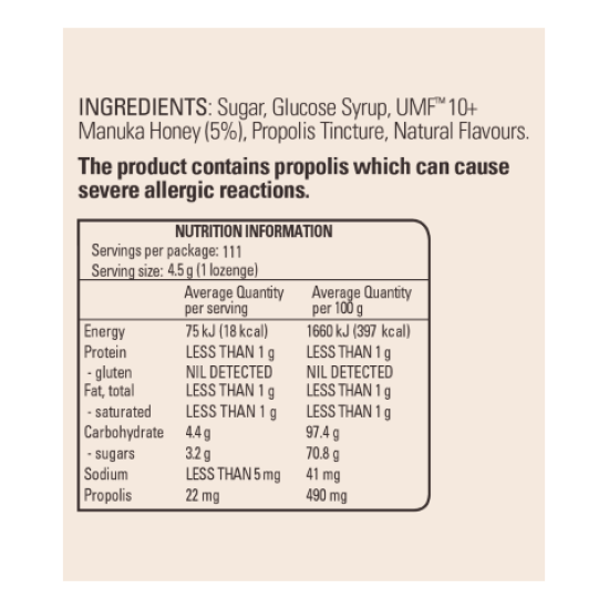 Sugar, Glucose Syrup, UMF™ 10+ Manuka Honey (5%), Propolis Tincture, Natural Flavours. Zesty Lemon flavour.