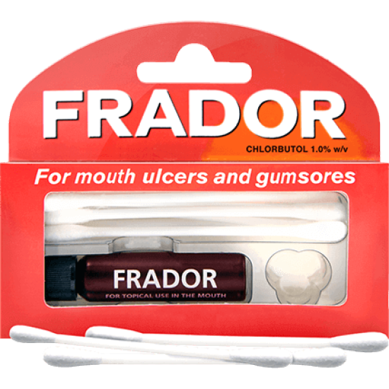 Stand bottle in tray provided. Dry ulcer. Using applicator, apply Frador directly to mouth ulcer.