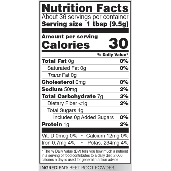 Each tablespoon serving of NOW® Sports Beet Root Powder is equivalent to 2.5 whole beets.