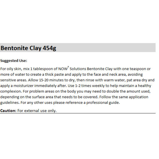 For oily skin, mix 1 tablespoon of NOW® Solutions Bentonite Clay with one teaspoon or more of water to create a thick paste and apply to the face and neck area, avoiding sensitive areas.