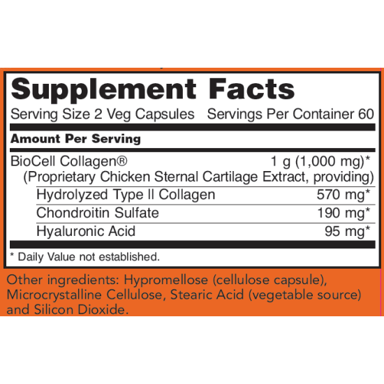 BioCell Collagen supports healthy joint function by providing collagen type 2, chondroitin sulphate and hyaluronic acid (Type2 collagen is the most abundant structural component found in joint cartilage matrix).