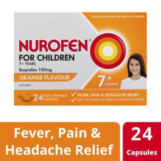 Nurofen For Children Soft Chewable Capsules provides temporary relief of mild to moderate pain such as a sore throat, dental pain, ear ache, headache, minor aches, sprains, strains and pain of cold and flu as well as fever reduction.