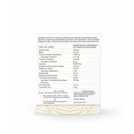 Formulated with a blend of natural antioxidant and anti-glycant ingredients, Vida Glow Anti-G-Ox helps to support the body against damaging environmental and lifestyle factors that affect cellular health.