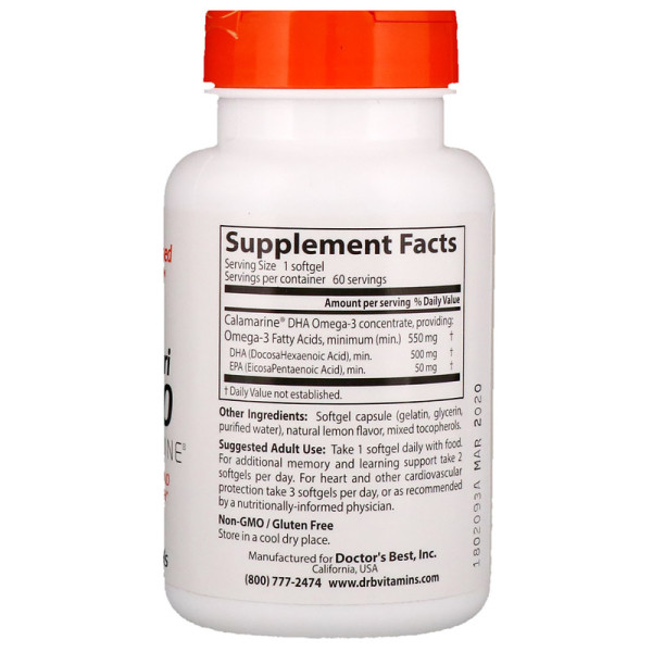 Doctor's Best DHA 500 from Calamari 500mg 60 SoftgelsDHA (Docosahexaenoic Acid, omega-3) is a building block for the cell membranes that manage life processes.This vitamin-like nutrient and others metabolically derived from it are vital to mental performance, heart and blood vessel health, vision, i..