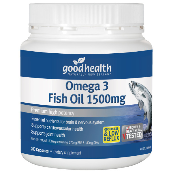 Good Health Omega 3 Fish Oil 1500mg 200 CapsulesHigh strength1500mg wild fish oilRich source of omega 3Naturally occurring EPA & DHAMercury lead testedGood Health uses international testing methods to validate the Omega 3 content of our fish oil, and to ensure that oxidation levels comply with r..