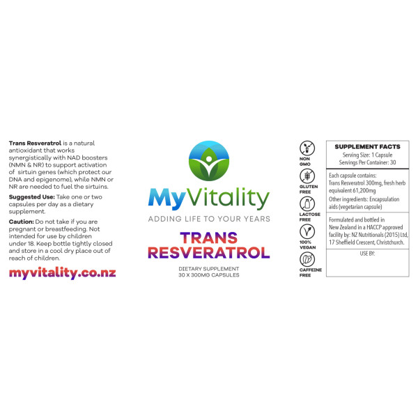 MyVitality Trans Resveratrol 300mg 30 CapsulesResveratrol is a natural antioxidant. It works synergistically with the NAD boosters NMN and NR to support the activation of the sirtuin genes (these protect our DNA and epigenome).Trans-Resveratrol 30 x 300mg high purity capsules300mg of Trans Resveratr..