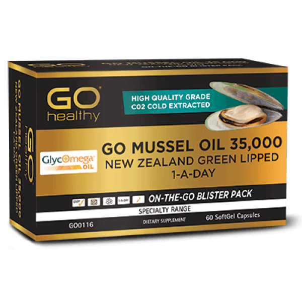 GO Healthy GO Mussel Oil 35,000mg 60 CapsulesGO MUSSEL OIL 35,000 NEW ZEALAND GREEN LIPPED 1-A-DAY contains premium grade, New Zealand sourced Green Lipped Mussel GlycOmegaâ„¢-Oil, which is extracted from fresh Green Lipped mussels harvested from the pristine waters in the Marlborough Sounds. GlycOmeg..
