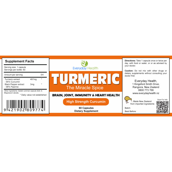 Everyday Health Turmeric Curcumin 60 CapsulesNatural anti-inflammatorySuper AntioxidantsNatural Pain ReliefTurmeric is part of Ayurvedic medicine and culinary. This herbs active ingredient is Curcumin, this active active component can produce beneficial antioxidant activities for the cardiovascular ..